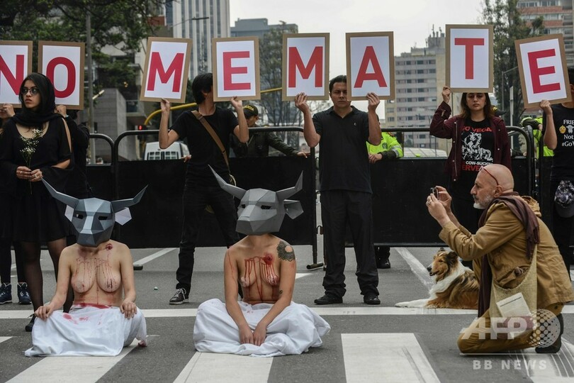 コロンビアの首都ボゴタにあるサンタマリア闘牛場近くで闘牛の廃止を求めるデモ参加者たち(2019年2月24日撮影)。(c)JOAQUIN SARMIENTO / AFP