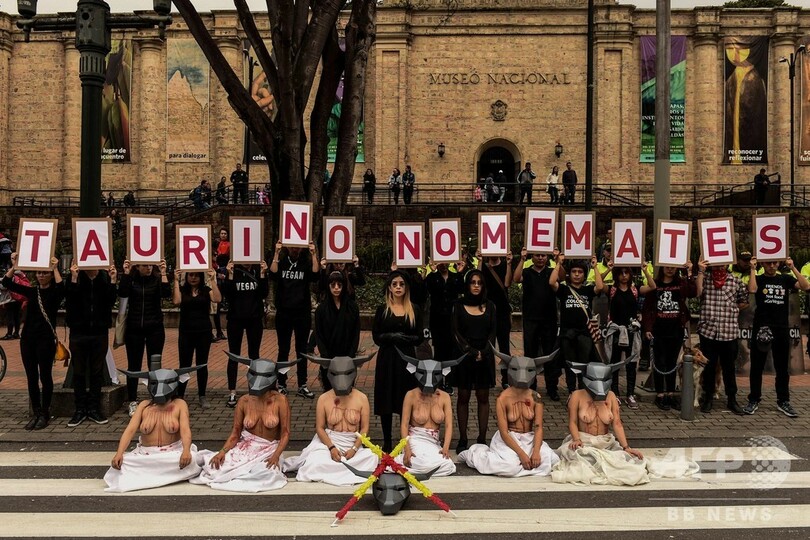 参加者たちは2月24日、牛に模したお面をかぶり、上半身裸で抗議したほか、「闘牛を支持する方々、私を殺さないで」と書かれたプラカードを掲げて伝統文化である闘牛の廃止を訴えた。(c)AFP