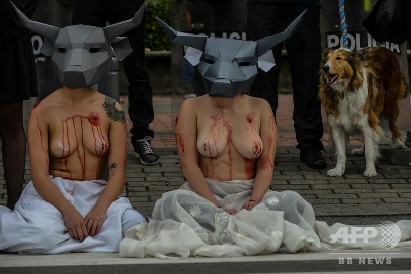「殺さないで」、上半身裸で闘牛廃止訴え コロンビア