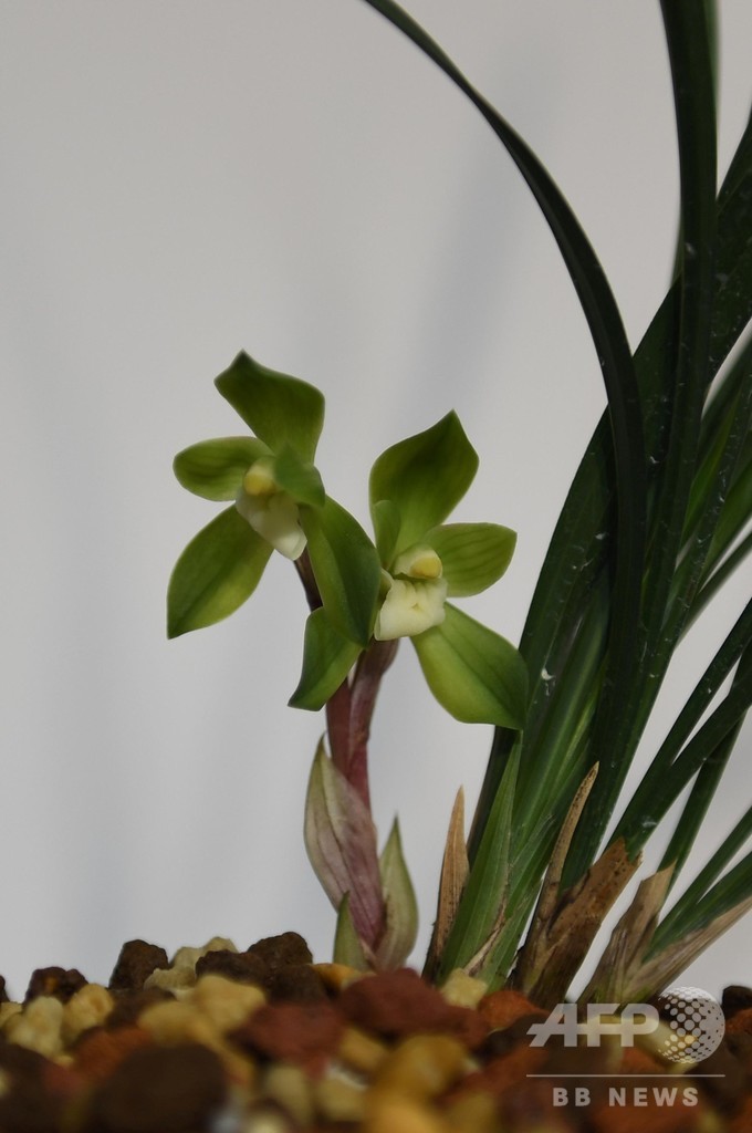 春蘭の「赤穀荷素」は、希少な品種だ。春蘭の花は通常、1本の花茎に1輪の花が咲くが、2輪の花がつくことは極めてまれだとされている。(c)CNS/JCM/AFPBB News