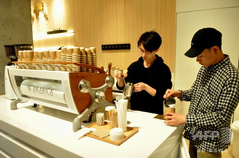 日本でも「インスタ映え」するとして人気の店だ。エスプレッソ、マキアート、ラテなどコーヒー各種のほか、レモネードやソーダ水を提供する。店のコーヒーマシンなどすべて特別にデザインしたもので、インターネットで多くのフォロワーがいる人たちなどを引き付けている。(c)CNS/JCM/AFPBB News
