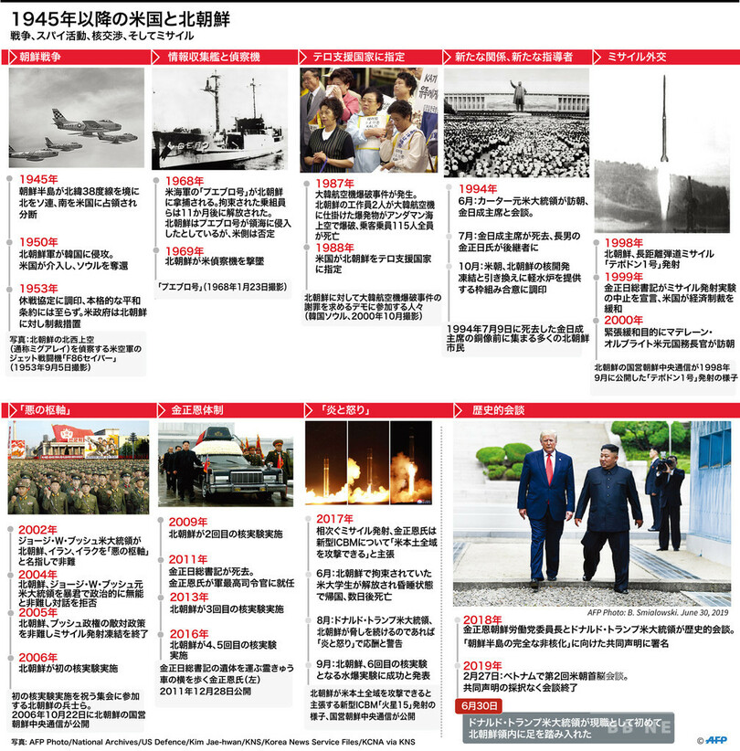 ニュース 政治・経済 特集:北朝鮮情勢 AFPの図解で見る米朝関係の歴史、1945年以降 2019年7月1日 20:45 発信地:その他 [ 米国 北米 北朝鮮 韓国・北朝鮮 ] このニュースをシェア 画像作成中 この写真にはショッキングな表現、または18歳以上の年齢制限の対象となる内容が含まれます。ご覧になる場合にはご了承の上、クリックしてください。 この画像を見る ❯ {{photo.ind}}/11 画像作成中 {{photo.ind}}/11 画像作成中 ! 【7月1日 AFPBB News】1945年以降の米国と北朝鮮の関係を、AFPの図解と写真でまとめた。(c)AFPBB News 特集:北朝鮮情勢 米国と北朝鮮による史上初の首脳会談が6月12日にシンガポールで開催された。核実験やミサイル発射、アメリカや日本との対立など、北朝鮮をめぐるこれまでの動きを記事で振り返る。 政治・経済 一覧へ> メディア・報道関係・法人の方向け 写真・動画 購入のお問合せ>