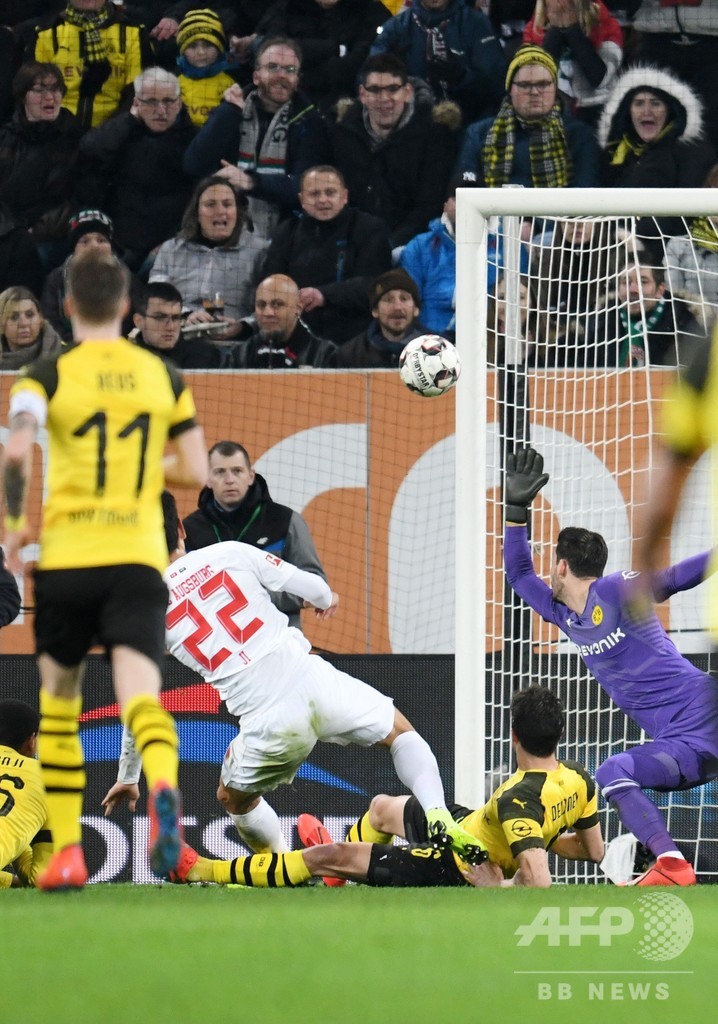 2週間前のバイエルン戦でも得点していた池は、前半に先制点を決めると、後半には見事なチップキックから追加点を決めた。その後ドルトムントの反撃をパコ・アルカセル(Francisco 'Paco' Alcacer Garcia)の1ゴールに抑えたアウクスブルクは、15位のままながらも降格圏に5ポイント差をつけた。(c)AFP/Ryland JAMES