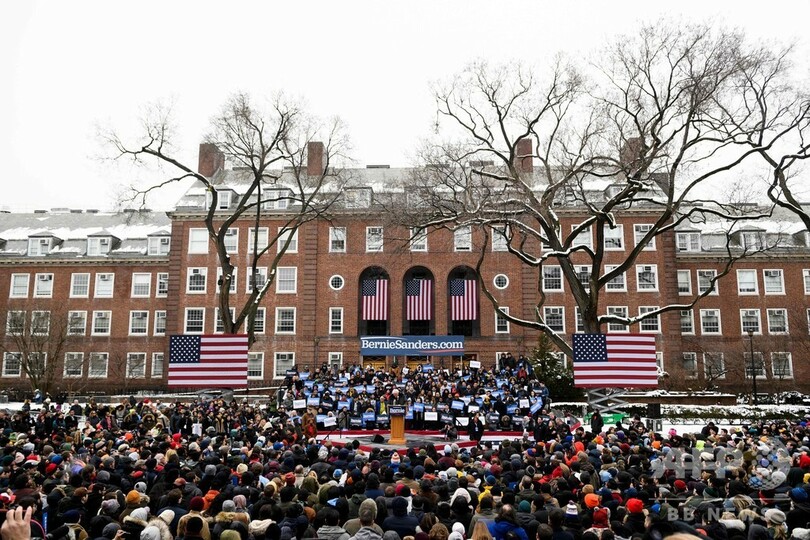 会場となった生まれ故郷のニューヨーク・ブルックリン(Brooklyn)地区にある母校ブルックリン大学(Brooklyn College)には、数千人の聴衆が集まった。サンダース氏は自信あふれる声で、今では民主党の主流とみなされているリベラルで市民中心主義的な多くの政策について語った。
