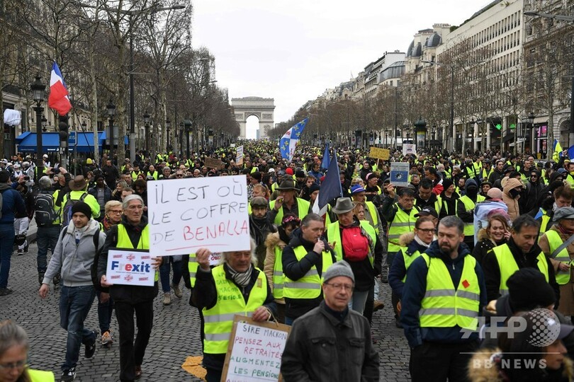 昨年11月17日に黄ベスト運動が始まって以来、デモとの関連でこれまでに11人の死者が出ている。一方、毎週末のデモ参加者数は初回の28万2000人から減少を続けている。(c)AFP/Alexandra DEL PERAL and France bureaux