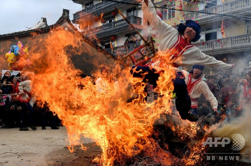 【3月6日 CNS】中国・福建省(Fujian)莆田市(Putian)にある莆禧(Puxi)古城で行われた、「燃えるたき火」を飛び越えて幸福を祈願する行事。頭巾をかぶりかごを担いだ若者たちが次々と火を飛び越え、新年の景気や健康などを祈った。(c)CNS/JCM/AFPBB News