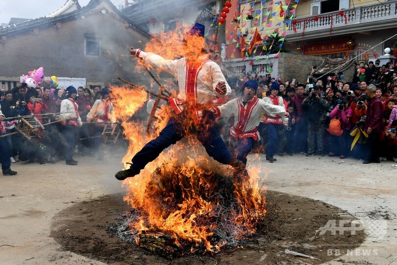 その火を飛び越してこい! 福建省莆田市で幸福祈願の伝統行事