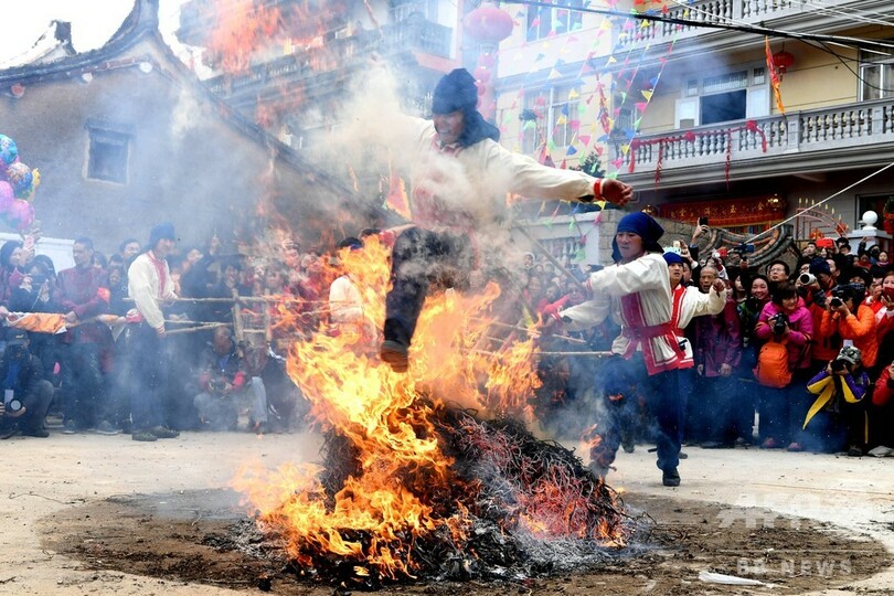 その火を飛び越してこい! 福建省莆田市で幸福祈願の伝統行事