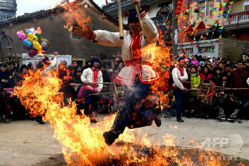 その火を飛び越してこい! 福建省莆田市で幸福祈願の伝統行事