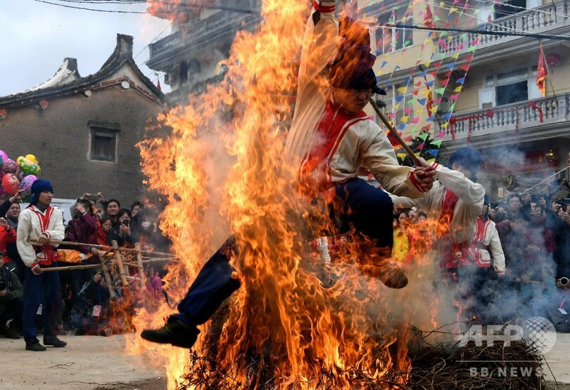 その火を飛び越してこい! 福建省莆田市で幸福祈願の伝統行事