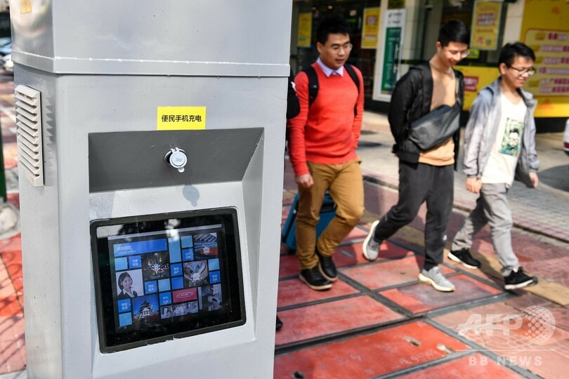スマート街灯は、監視カメラや道路標示、電気自動車の充電機能を併せ持つ。市民は街灯基部にあるタッチパネル式の画面上で交通状況や都市情報などを検索できる。(c)CNS/JCM/AFPBB News