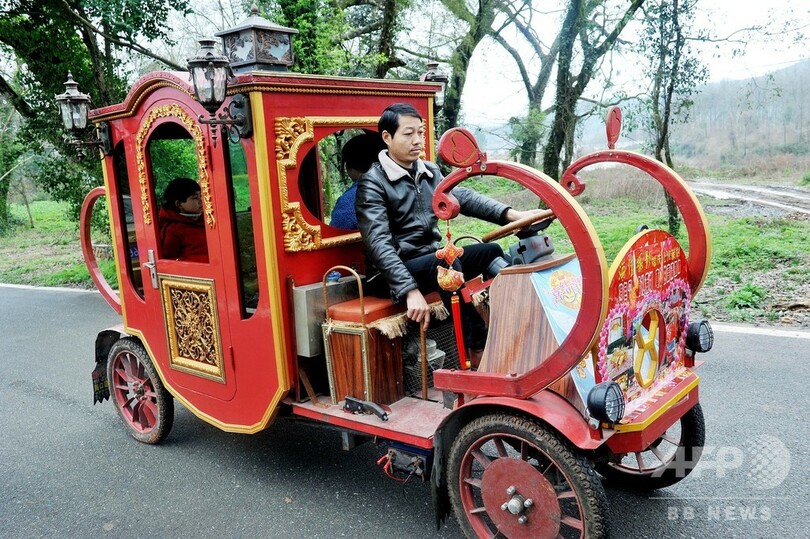 長さ4メートル、高さ2メートル、幅1.6メートルの車体は、後ろから見るとまるで婚礼で使う豪華な「花轎(Huajiao、花嫁を乗せる御輿)」のようだ。(c)CNS/JCM/AFPBB News