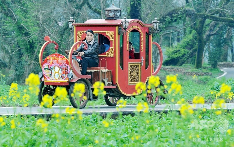長さ4メートル、高さ2メートル、幅1.6メートルの車体は、後ろから見るとまるで婚礼で使う豪華な「花轎(Huajiao、花嫁を乗せる御輿)」のようだ。(c)CNS/JCM/AFPBB News
