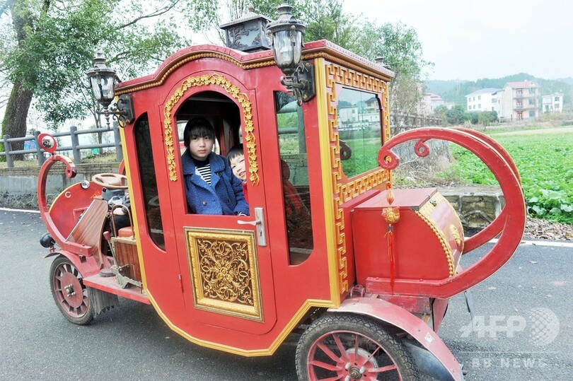 長さ4メートル、高さ2メートル、幅1.6メートルの車体は、後ろから見るとまるで婚礼で使う豪華な「花轎(Huajiao、花嫁を乗せる御輿)」のようだ。(c)CNS/JCM/AFPBB News
