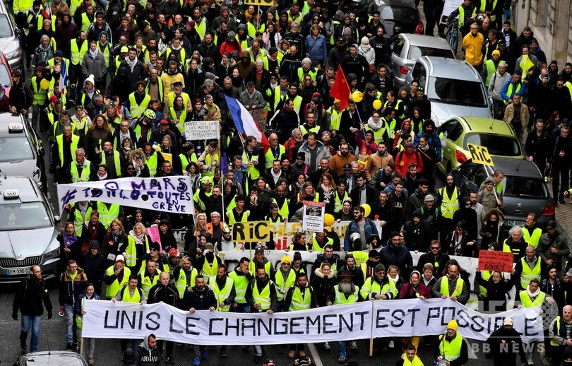 【3月10日 AFP】エマニュエル・マクロン(Emmanuel Macron)仏大統領の政策に抗議する「ジレ・ジョーヌ(黄色いベスト、gilets jaunes)」運動は9日、17週目を迎え、国内各地でデモ行進が行われた。しかし、デモ参加者総数は運動が始まって以来最低となり、約4か月が経過した運動から当初の熱気が失われつつあることがうかがえる。