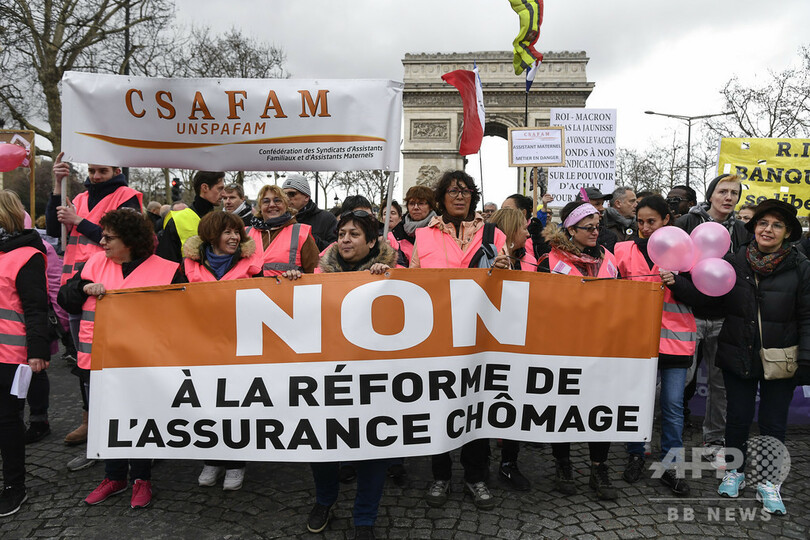 この他、9日には保育園や介護業界で働く人たちが「ピンクのベスト」を着用し、仏各地で小規模なデモを行った。税制や待遇改善を求めるデモの総参加者数は約1000人に上ったという。(c)AFP/Shahzad ABDUL and Marie DUMIERES