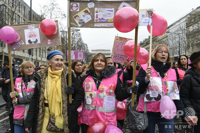 この他、9日には保育園や介護業界で働く人たちが「ピンクのベスト」を着用し、仏各地で小規模なデモを行った。税制や待遇改善を求めるデモの総参加者数は約1000人に上ったという。(c)AFP/Shahzad ABDUL and Marie DUMIERES