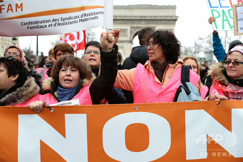 この他、9日には保育園や介護業界で働く人たちが「ピンクのベスト」を着用し、仏各地で小規模なデモを行った。税制や待遇改善を求めるデモの総参加者数は約1000人に上ったという。(c)AFP/Shahzad ABDUL and Marie DUMIERES