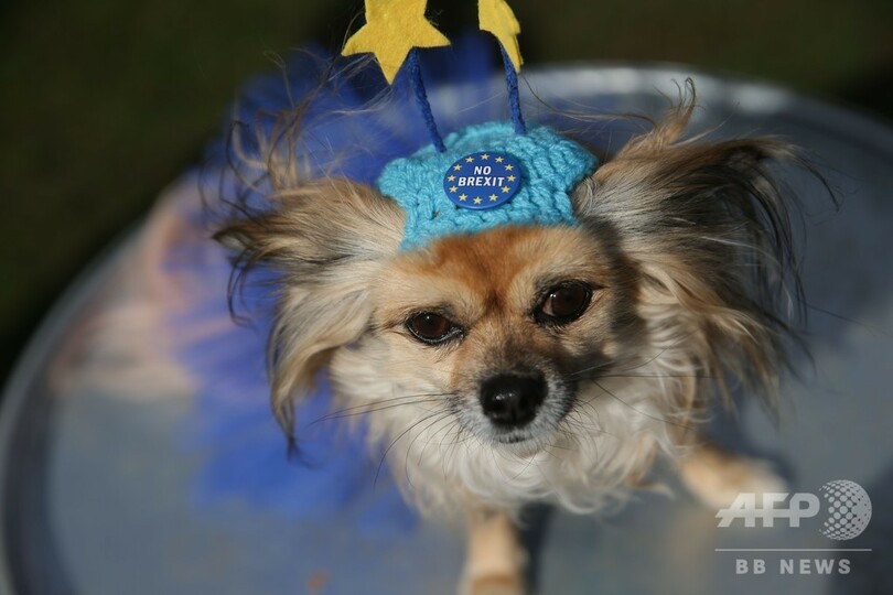 【3月11日 AFP】英ロンドン中心部の国会議事堂前で10日、英国の欧州連合(EU)からの離脱(ブレグジット、Brexit)に反対する市民らが愛犬を連れて集まり、犬の鳴き声をもじって「ウーファレンダム(Wooferendum)」と題したキャンペーンを行った。