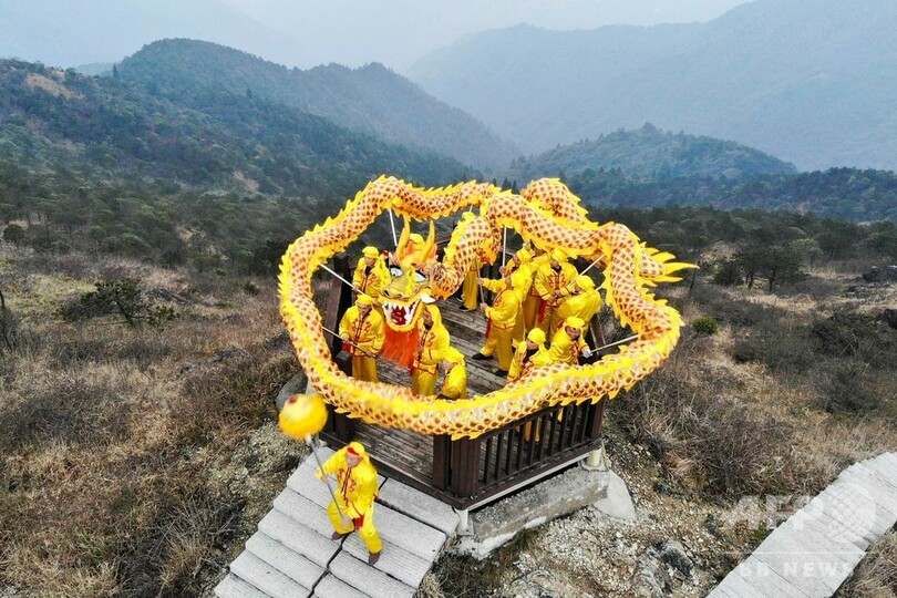 【3月19日 CNS】中国・浙江省(Zhejiang)竜泉山(Longquanshan)の山の上を舞う「群竜」。旧暦2月2日「竜抬頭(Long Taitou)」の前夜に、現地少数民族の「畲(She)族」の人々が海抜1929メートルの山頂で伝統民俗文化「竜の舞」を「盘(まわる)、騰(とぶ)、穿(うがつ)」などの技巧を用いて踊り、安定した気候や豊作を祈願した。(c)CNS/JCM/AFPBB News