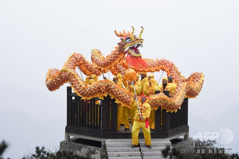 【3月19日 CNS】中国・浙江省(Zhejiang)竜泉山(Longquanshan)の山の上を舞う「群竜」。旧暦2月2日「竜抬頭(Long Taitou)」の前夜に、現地少数民族の「畲(She)族」の人々が海抜1929メートルの山頂で伝統民俗文化「竜の舞」を「盘(まわる)、騰(とぶ)、穿(うがつ)」などの技巧を用いて踊り、安定した気候や豊作を祈願した。(c)CNS/JCM/AFPBB News