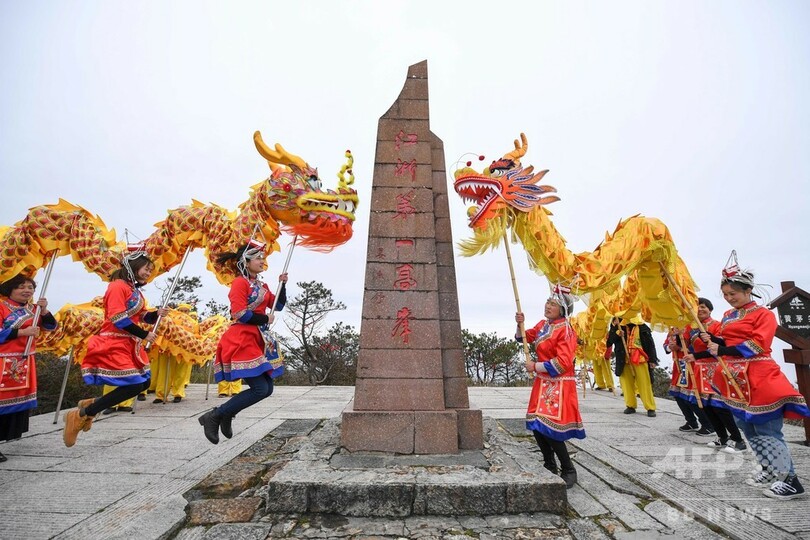 【3月19日 CNS】中国・浙江省(Zhejiang)竜泉山(Longquanshan)の山の上を舞う「群竜」。旧暦2月2日「竜抬頭(Long Taitou)」の前夜に、現地少数民族の「畲(She)族」の人々が海抜1929メートルの山頂で伝統民俗文化「竜の舞」を「盘(まわる)、騰(とぶ)、穿(うがつ)」などの技巧を用いて踊り、安定した気候や豊作を祈願した。(c)CNS/JCM/AFPBB News