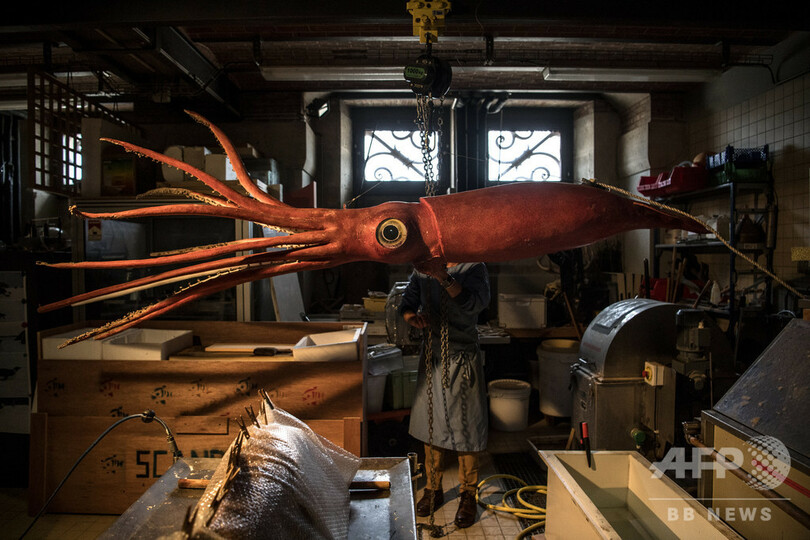 【4月30日 AFP】仏・パリの国立自然史博物館(French National Museum of Natural History)の作業場で、修復前に巨大イカをウインチで巻き上げる同館の主任剥製師。(c)AFP