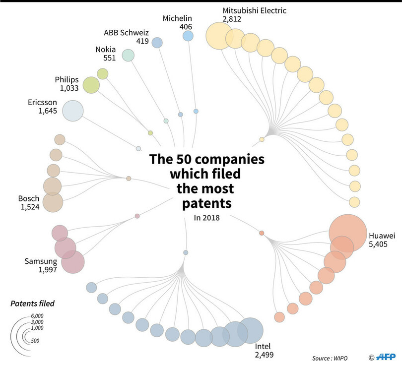 企業別では、中国の通信機器大手、華為技術(ファーウェイ、Huawei)が5405件を出願し、一企業としての最多記録を更新した。(c)AFP