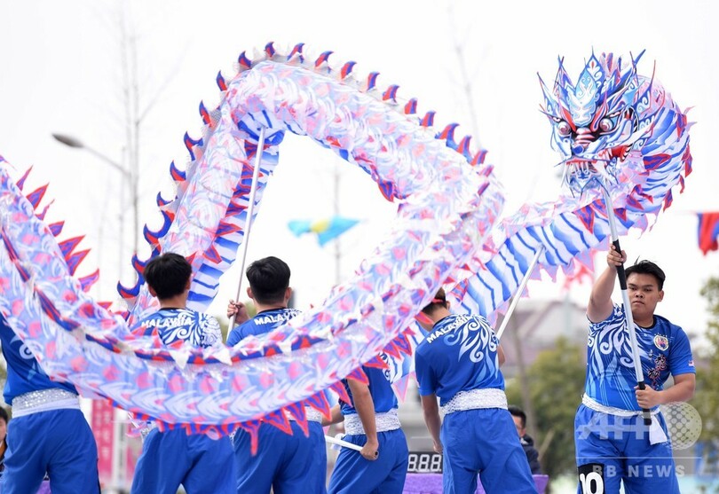 「江蘇省竜踊・獅子舞の里」と呼ばれている西来橋鎮(Xilaiqiao)を会場に、タイ、マレーシアなど国外や国内各地から合計21チームが集まった。(c)CNS/JCM/AFPBB News