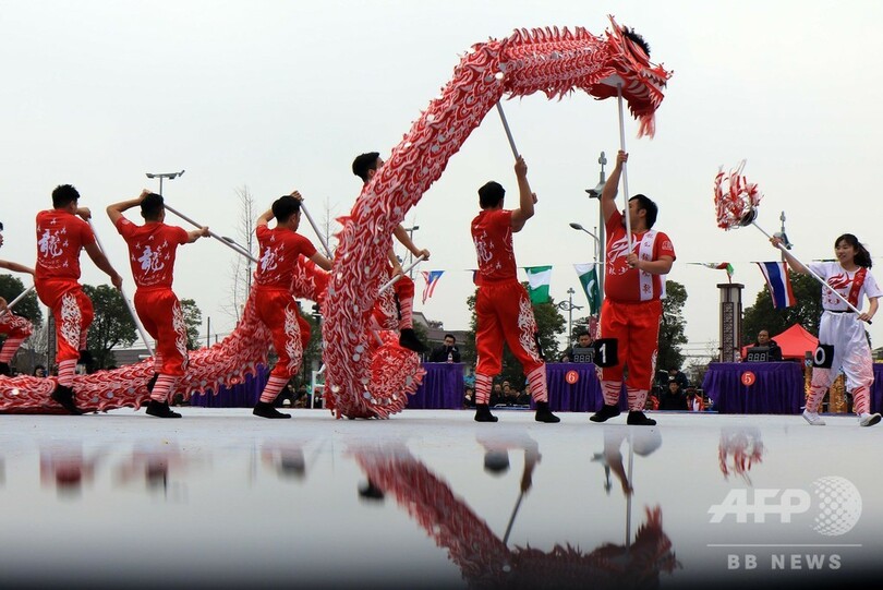 「江蘇省竜踊・獅子舞の里」と呼ばれている西来橋鎮(Xilaiqiao)を会場に、タイ、マレーシアなど国外や国内各地から合計21チームが集まった。(c)CNS/JCM/AFPBB News