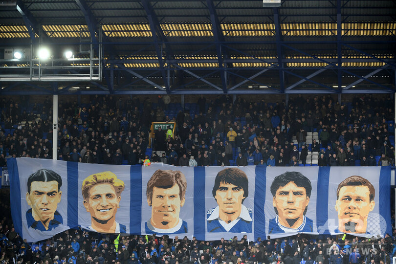 【3月31日 AFP】英北西部リバプールで行われたサッカーのイングランド・プレミアリーグ、エバートン(Everton)対チェルシー(Chelsea)戦に先立ち、グディソン・パーク(Goodison Park)のスタンドに広げられたエバートン主力選手の巨大な肖像画。(c)AFP