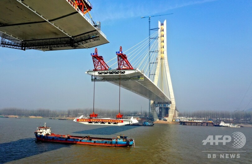陸上部分も含めた大橋の全長は41.026キロで、長江をまたぐ長江大橋部分は長さ5.8キロで、主塔の高さが237メートルの2本柱形の斜張橋だ。現在、大橋の完成まで最後のカウントダウン段階に入っており、予定では3月末に橋桁の接合工事が完了し、6月末には車両が通行できるようになるという。(c)CNS/JCM/AFPBB News