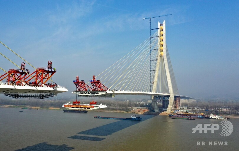 陸上部分も含めた大橋の全長は41.026キロで、長江をまたぐ長江大橋部分は長さ5.8キロで、主塔の高さが237メートルの2本柱形の斜張橋だ。現在、大橋の完成まで最後のカウントダウン段階に入っており、予定では3月末に橋桁の接合工事が完了し、6月末には車両が通行できるようになるという。(c)CNS/JCM/AFPBB News