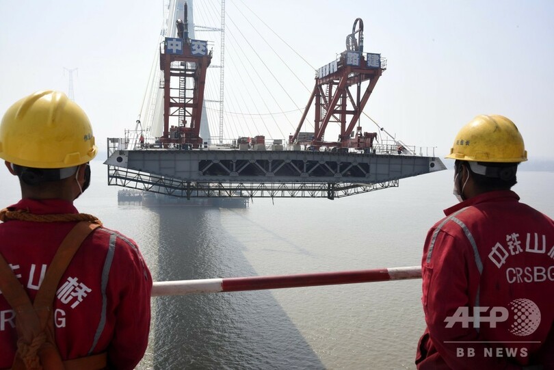 陸上部分も含めた大橋の全長は41.026キロで、長江をまたぐ長江大橋部分は長さ5.8キロで、主塔の高さが237メートルの2本柱形の斜張橋だ。現在、大橋の完成まで最後のカウントダウン段階に入っており、予定では3月末に橋桁の接合工事が完了し、6月末には車両が通行できるようになるという。(c)CNS/JCM/AFPBB News