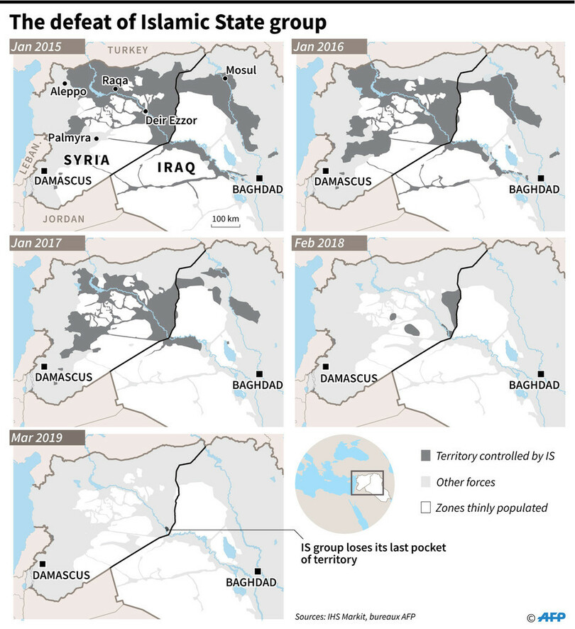 【3月23日 AFP】(更新、写真追加)米軍の支援を受けてイスラム過激派組織「イスラム国(IS)」の掃討作戦を行っていたクルド人主体の民兵組織「シリア民主軍(SDF)」は23日、シリア東部に位置するISの最後の拠点を完全に掌握し、「カリフ制国家」が完全に壊滅したと宣言した。