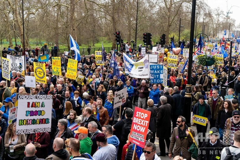 【3月24日 AFP】欧州連合(EU)離脱(ブレグジット、Brexit)をめぐり国内政治がまひ状態にある英国で23日、残留支持派の人々がロンドンに集結し、2度目の国民投票実施を求めてデモ行進した。「Put it to the People(国民に投票させろ)」と題されたデモには、英全土から残留支持派が車や鉄道でロンドンに集結。主催者発表によると参加者は約100万人で、ここ数十年来で最大規模のデモとなった。