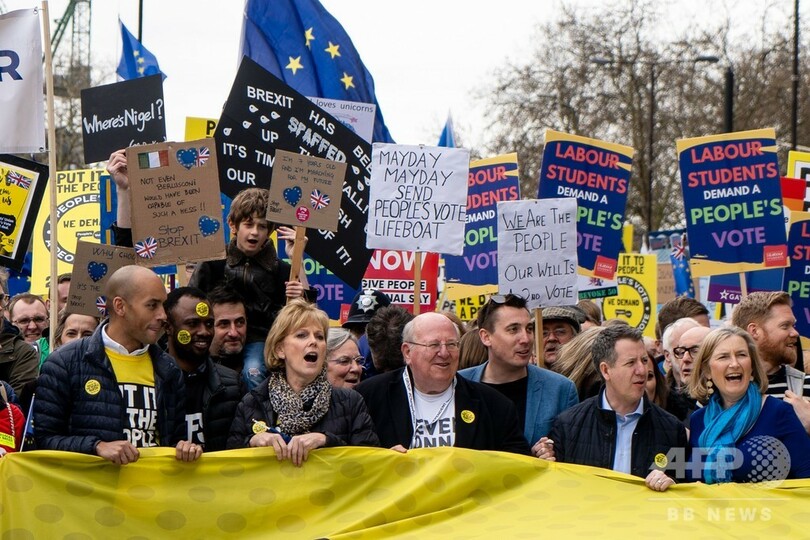 【3月24日 AFP】欧州連合(EU)離脱(ブレグジット、Brexit)をめぐり国内政治がまひ状態にある英国で23日、残留支持派の人々がロンドンに集結し、2度目の国民投票実施を求めてデモ行進した。「Put it to the People(国民に投票させろ)」と題されたデモには、英全土から残留支持派が車や鉄道でロンドンに集結。主催者発表によると参加者は約100万人で、ここ数十年来で最大規模のデモとなった。