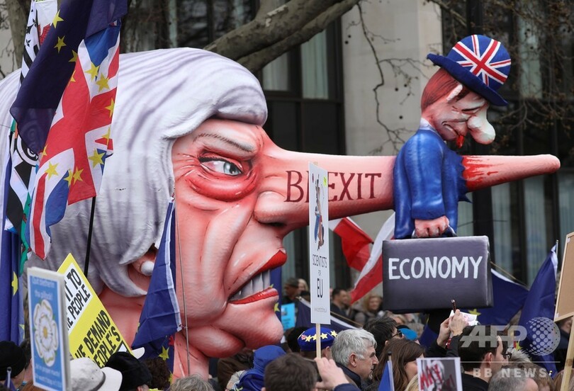 【3月24日 AFP】欧州連合(EU)離脱(ブレグジット、Brexit)をめぐり国内政治がまひ状態にある英国で23日、残留支持派の人々がロンドンに集結し、2度目の国民投票実施を求めてデモ行進した。「Put it to the People(国民に投票させろ)」と題されたデモには、英全土から残留支持派が車や鉄道でロンドンに集結。主催者発表によると参加者は約100万人で、ここ数十年来で最大規模のデモとなった。