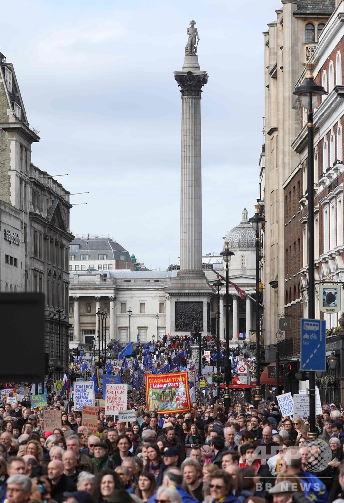 【3月24日 AFP】欧州連合(EU)離脱(ブレグジット、Brexit)をめぐり国内政治がまひ状態にある英国で23日、残留支持派の人々がロンドンに集結し、2度目の国民投票実施を求めてデモ行進した。「Put it to the People(国民に投票させろ)」と題されたデモには、英全土から残留支持派が車や鉄道でロンドンに集結。主催者発表によると参加者は約100万人で、ここ数十年来で最大規模のデモとなった。