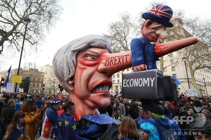 【3月24日 AFP】欧州連合(EU)離脱(ブレグジット、Brexit)をめぐり国内政治がまひ状態にある英国で23日、残留支持派の人々がロンドンに集結し、2度目の国民投票実施を求めてデモ行進した。「Put it to the People(国民に投票させろ)」と題されたデモには、英全土から残留支持派が車や鉄道でロンドンに集結。主催者発表によると参加者は約100万人で、ここ数十年来で最大規模のデモとなった。