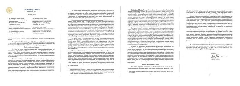 だがウィリアム・バー(William Barr)司法長官が議会に提出したロバート・モラー(Robert Mueller)特別検察官による捜査報告書の要約では、トランプ氏による司法妨害疑惑については結論が出されておらず、「この報告書は大統領が罪を犯したとは結論づけていないが、彼の嫌疑を晴らすものではない」と記されている。