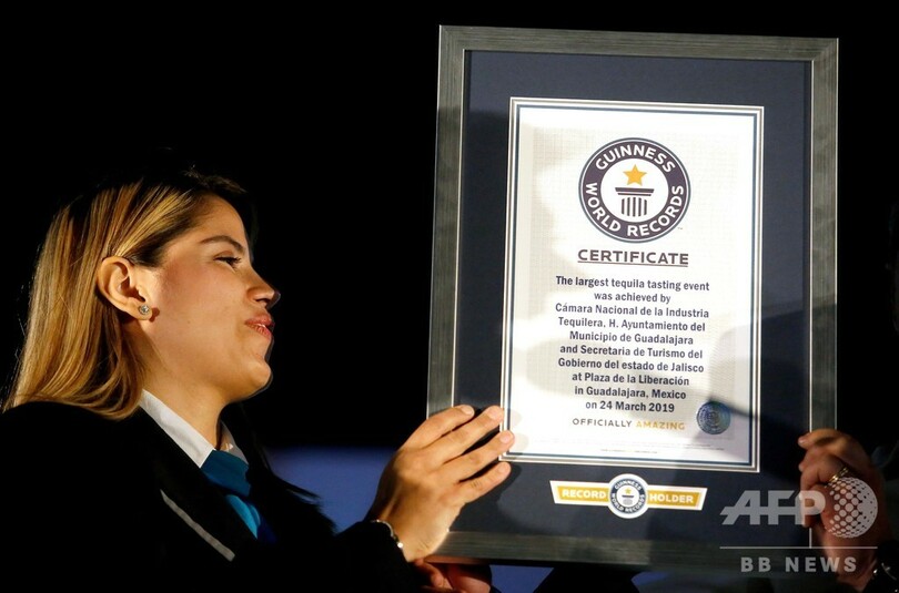 【3月26日 AFP】メキシコのハリスコ(Jalisco)州グアダラハラ(Guadalajara)にあるリベラシオン広場(Plaza Liberacion)で24日、1486人がテキーラの試飲を行い、「世界最大のテキーラの試飲」でギネス世界記録(Guinness World Record)に認定された。(c)AFP