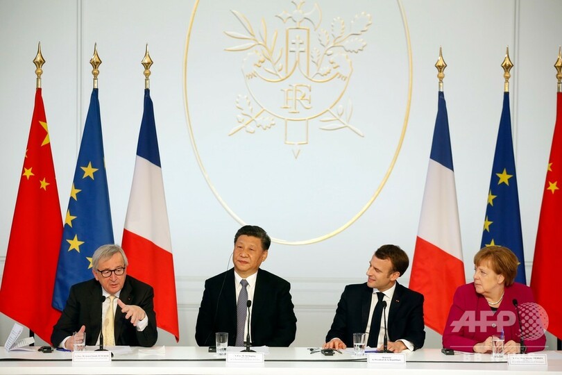 ドナルド・トランプ(Donald Trump)米政権の政策を発端とする緊張が高まる中、習主席はこの日、エマニュエル・マクロン(Emmanuel Macron)仏大統領、アンゲラ・メルケル(Angela Merkel)独首相、ジャンクロード・ユンケル(Jean-Claude Juncker)欧州委員会(European Commission)委員長と会談した。