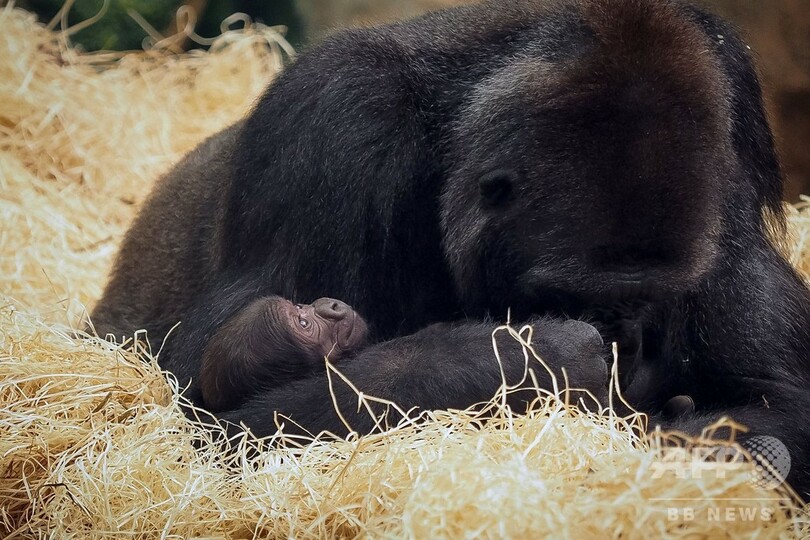 【3月27日 AFP】フランス中部サンテニャンシュルシェール(Saint-Aignan-sur-Cher)にあるボーバル(Beauval)動物園で、母親に抱っこされる雄の赤ちゃんゴリラ。生まれてから10日ほどの親子の姿を捉えた。(c)AFP