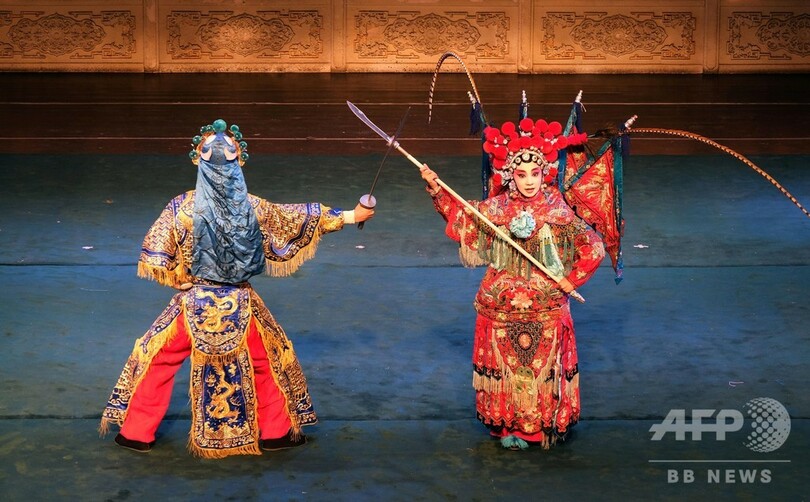 蘇さんの演じる『女殺四門』は、「刀馬旦(Daomadan、訳:立ち回りをする女性の役)」の真髄と技芸が最も生きる代表的な演目だ。「圓場(舞台上を円形に走る)」「翻身(体を翻して回転する)」「槍花(槍回し)」などの技が織り込まれている。蘇さんは今年14歳。10歳の時から瀋陽師範大学付属芸術学校で京劇を専門的に学んでいる。(c)CNS/JCM/AFPBB News