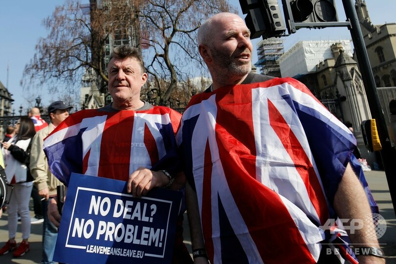 【3月29日 AFP】(更新)英議会は29日、テリーザ・メイ(Theresa May)首相が欧州連合(EU)とまとめた英国のEU離脱(ブレグジット、Brexit)協定案をめぐる3度目の採決を行い、またも否決した。これにより英国は、ブレグジットが長期にわたって延期されるか、混沌(こんとん)とした「合意なき離脱」を2週間後に迎えるかのいずれかとなった。