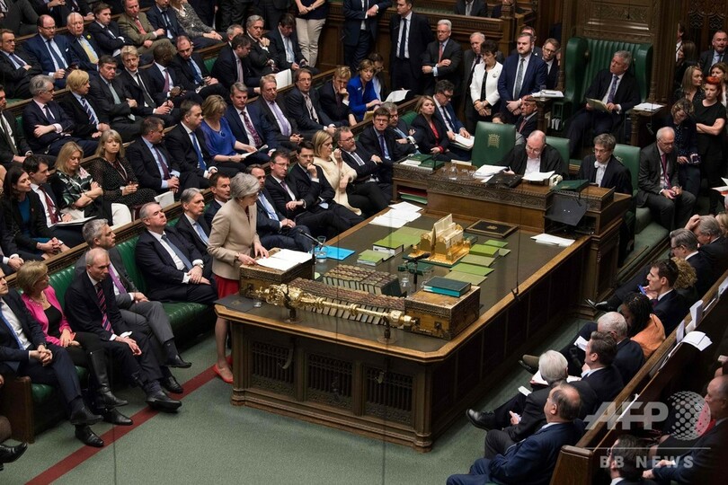 英議会はこの日、テリーザ・メイ(Theresa May)首相がEUとまとめた離脱協定案について3度目の採決を行ったが、同案はまたしても否決された。議事堂前の広場では、議員らに住民投票の結果を尊重するよう要求するデモが行われた。