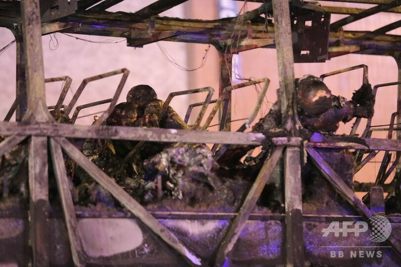 鎮火後のバスは大部分が骨組みだけとなっており、複数の遺体が依然座席に残されているのが見える。バスの上下階をつなぐ階段で窒息死した人もいる。
