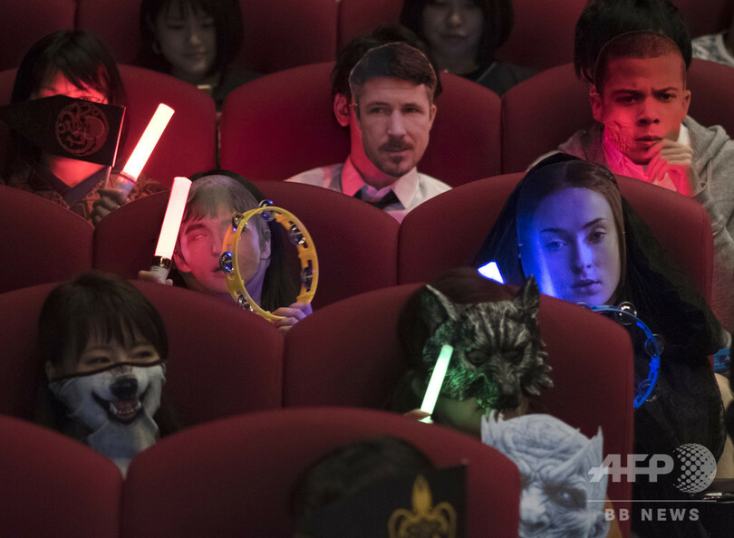 【4月16日 AFP】ドラマシリーズ「ゲーム・オブ・スローンズ(Game of Thrones)」最終章の世界同時放送に際し、東京の映画館で開かれたファンミーティングで声優らと共に祝うファン。(c)AFP