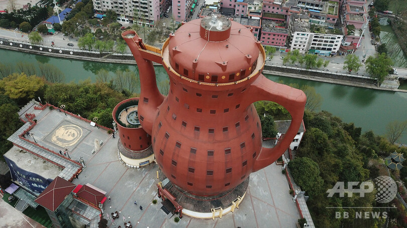 「天下第一壺」は体積2万8360立方メートル、高さ約74メートルで、中国独自に設立された新記録認定機関である「上海大世界基尼斯」(Shanghai China Records Headquarters)に2006年、「実物の急須の形をした造形物として最大の大きさ」と認定された。(c)CNS/JCM/AFPBB News